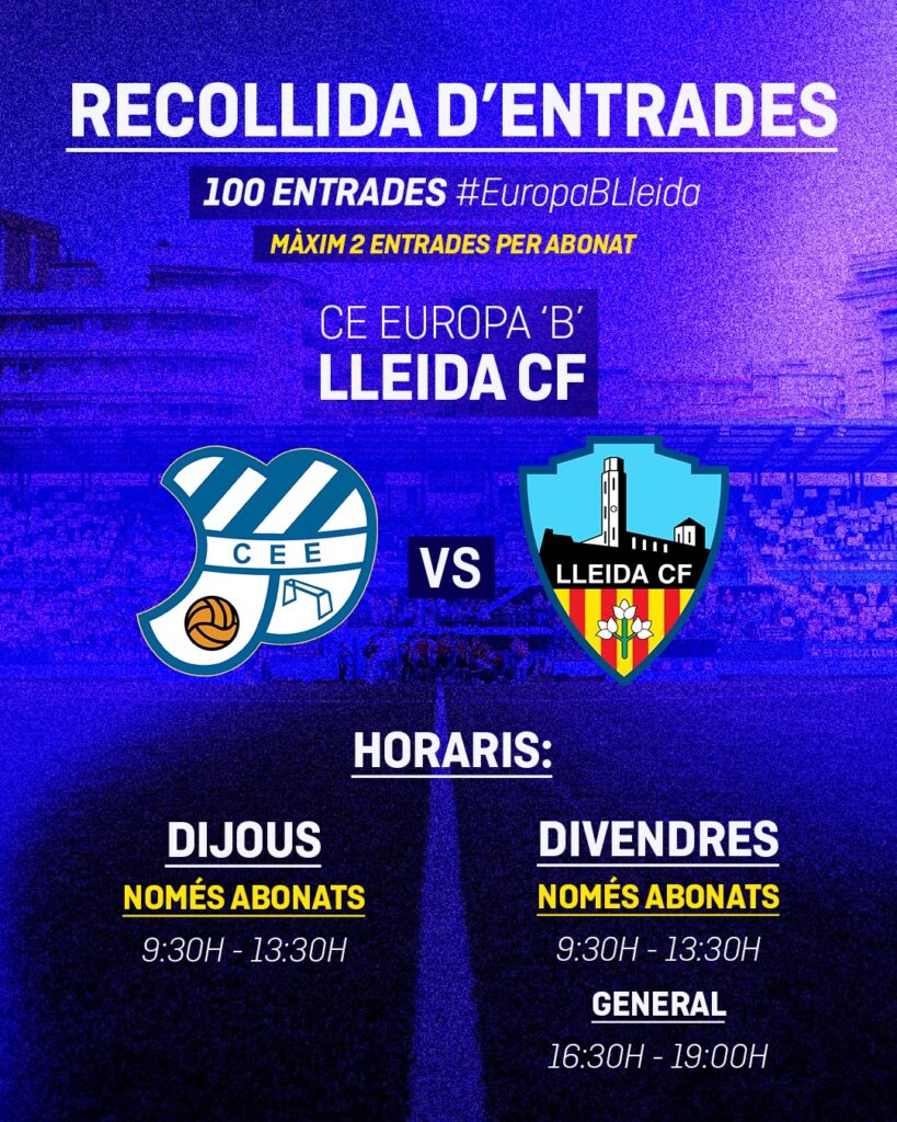 El Lleida CF posarà a disposició dels aficionats 100 entrades gratuïtes per al partit contra l’Europa B al Nou Sardenya.